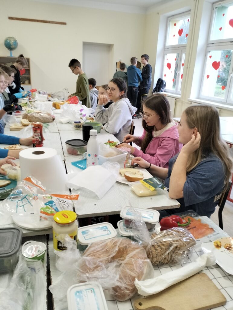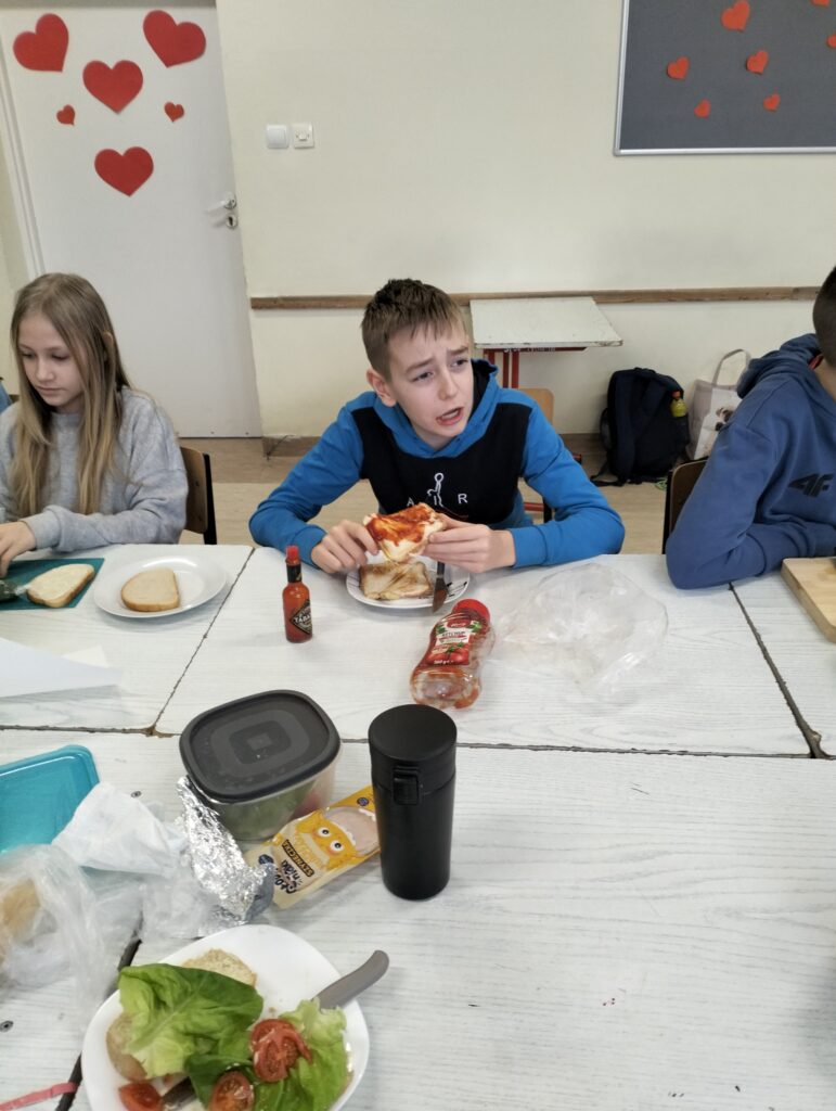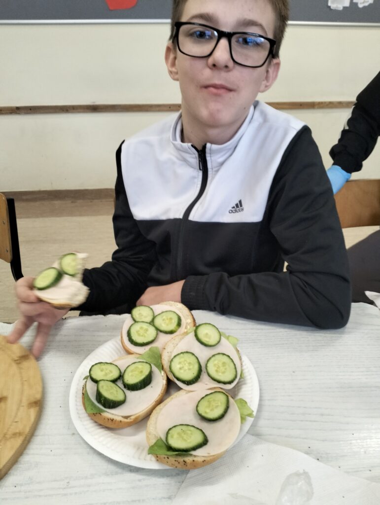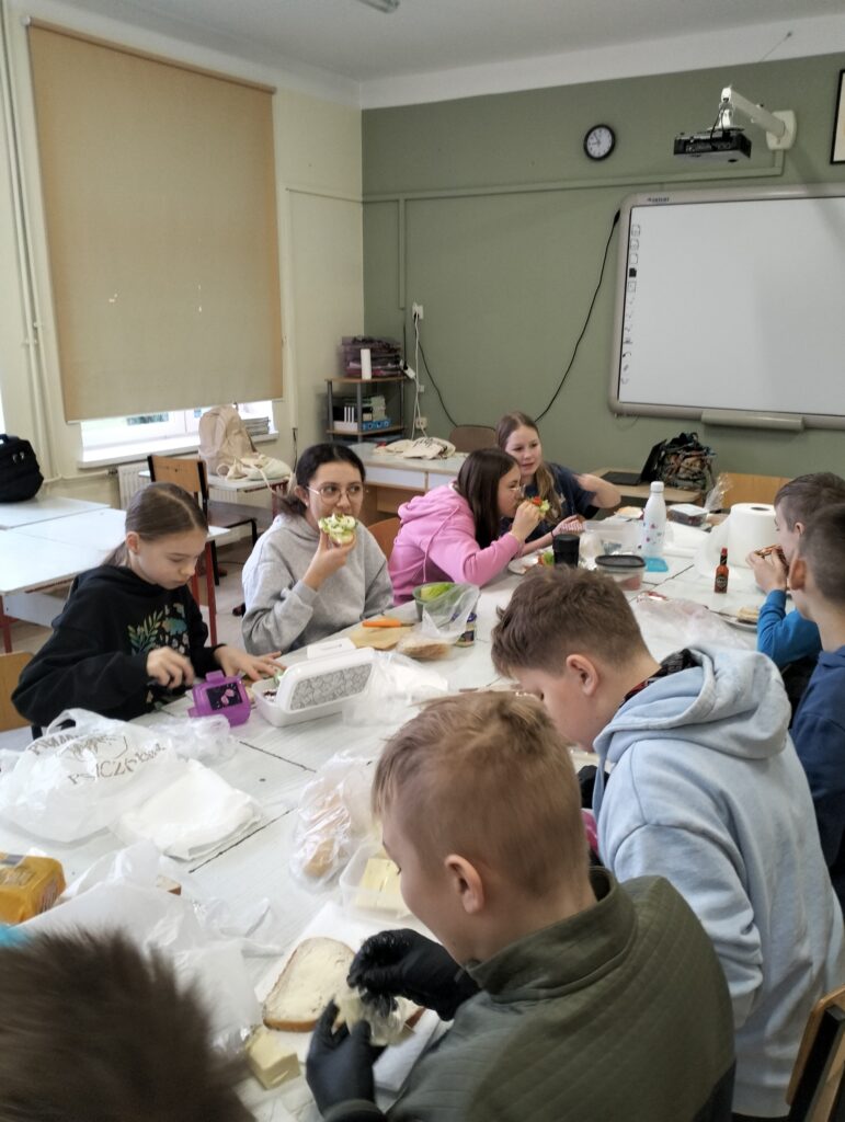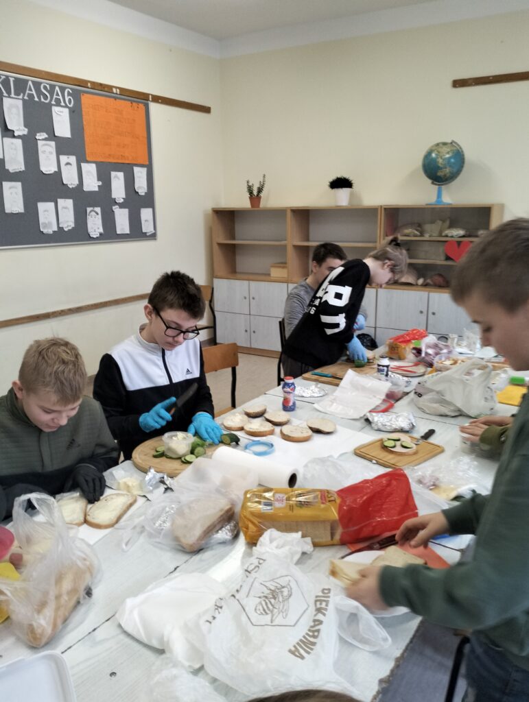 Dzisiejsza lekcja wychowawcza przebiegła po hasłem ,,KOLOROWO I ZDROWO”. Wspólnie przygotowaliśmy drugie śniadanie. Wszyscy udowodnili, że potrafią przygotować kanapki. Każdy przygotował takie, jakie lubi najbardziej. Było smakowicie i zdrowo. Myślę, że każdy zapamięta z dzisiejszej lekcji, że warzywa to cenny dodatek witaminowy do kanapek.