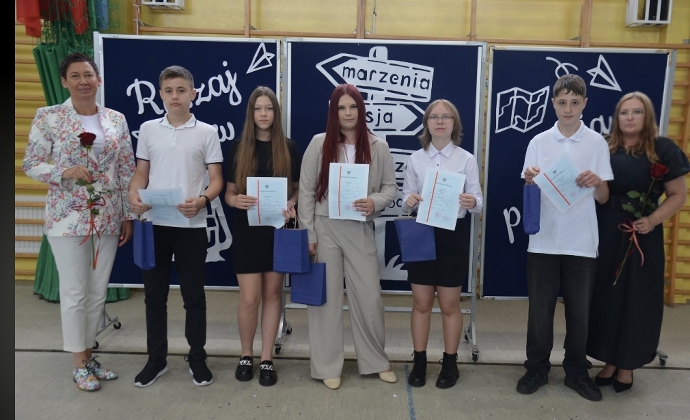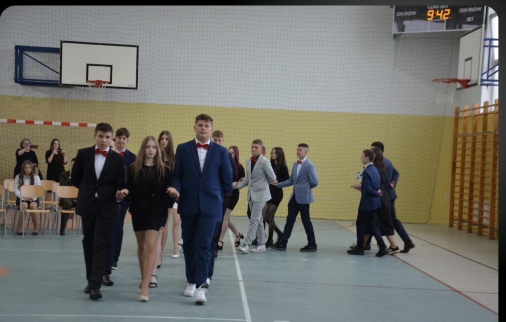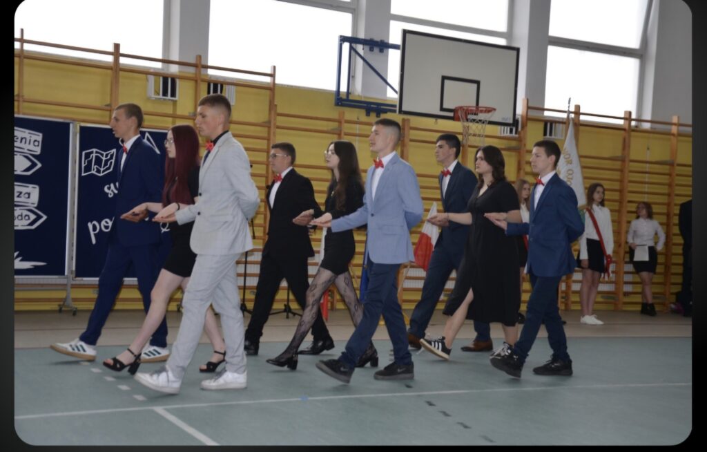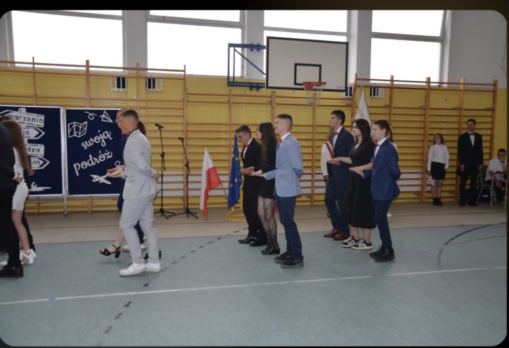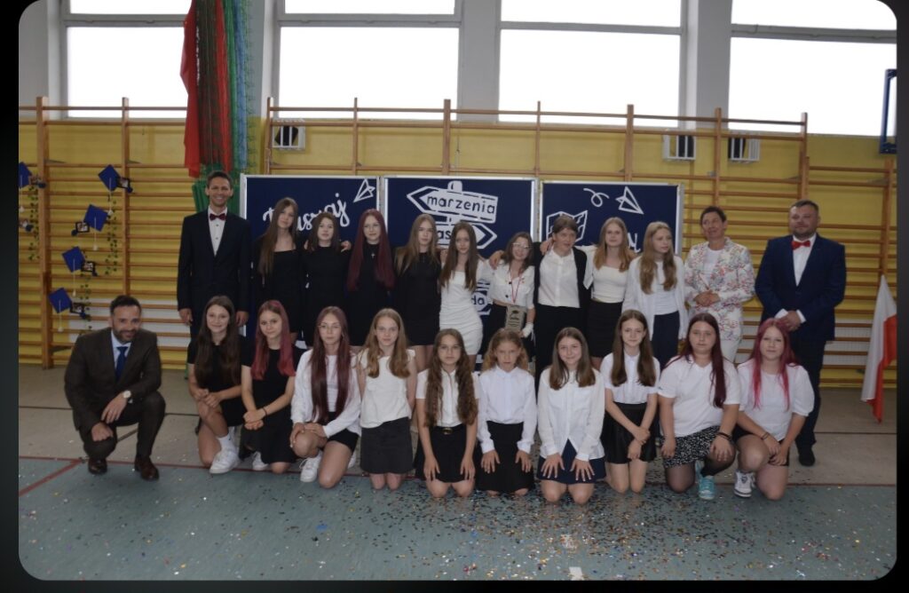 Szczególnie emocjonujące było pożegnanie uczniów klasy 8, którzy zakończyli swoją edukację w naszej szkole.  Pożegnali się oni fantastycznie wykonanym polonezem. Absolwenci otrzymali świadectwa, a ich Wychowawca, Dyrekcja oraz Rodzice zostali uhonorowani podziękowaniami za wspólne lata współpracy i zaangażowania. Klasa 7 przygotowała piękne pożegnanie, życząc starszym kolegom powodzenia na nowym etapie życia. Klasa 8 przekazała również kolegom z kl.7 opiekę nad Sztandarem Szkoły.