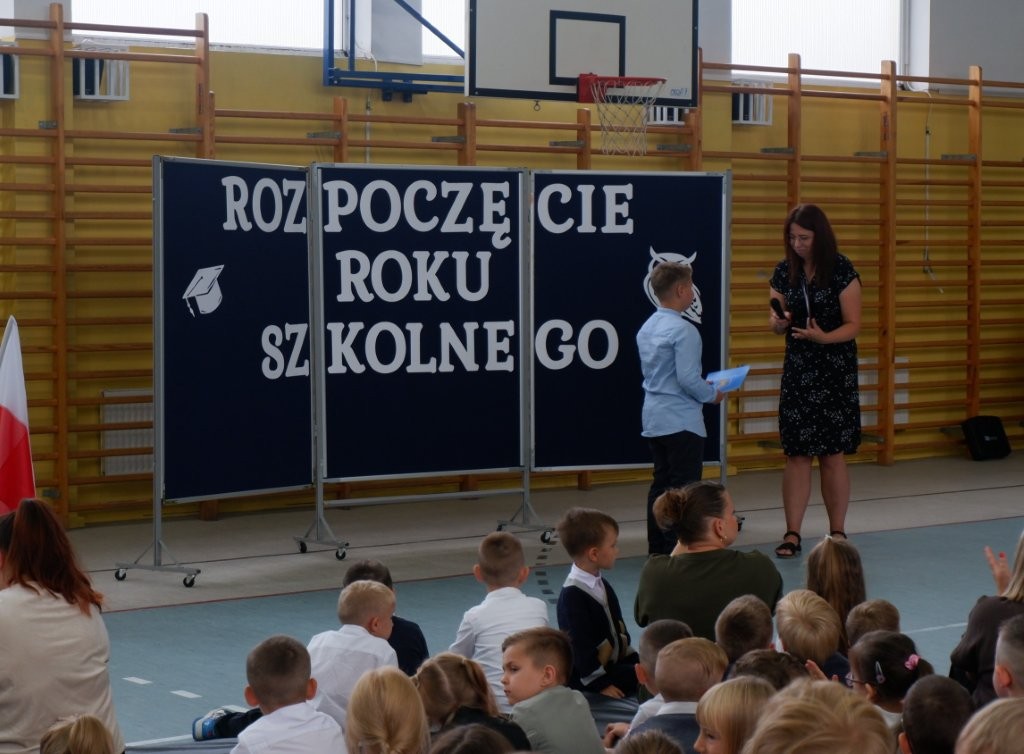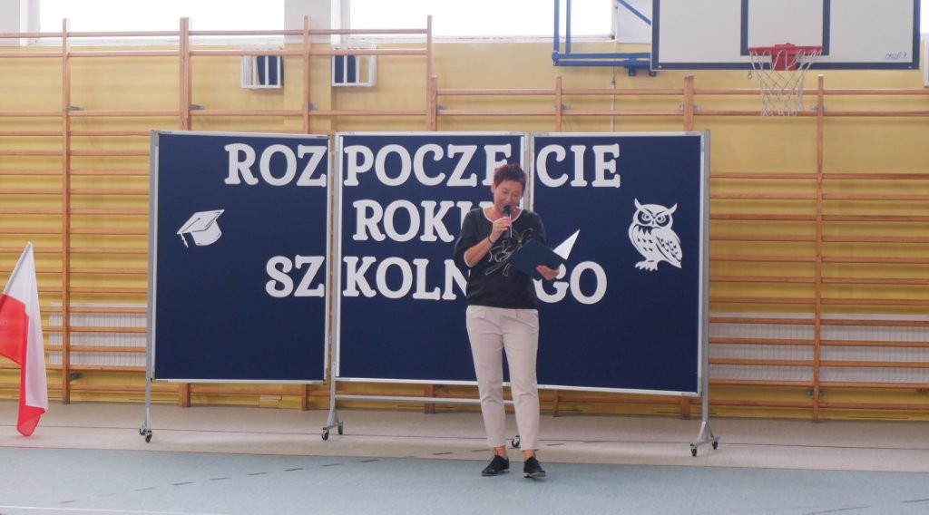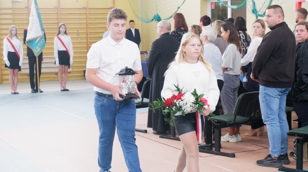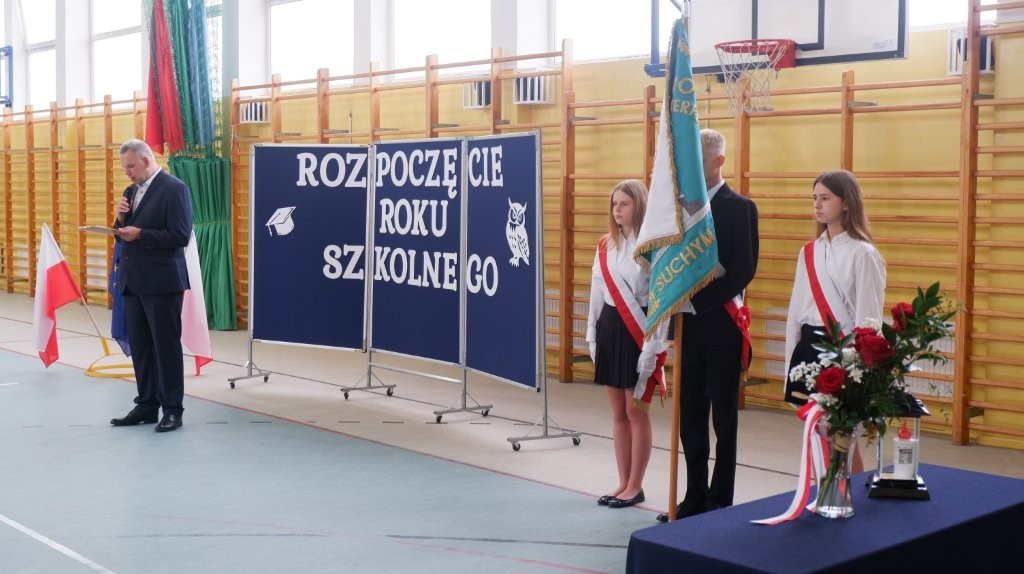 Inaugurację rozpoczęliśmy od wprowadzania pocztu sztandarowego, odśpiewania hymnu państwowego i powitania zgromadzonych. Potem przyszedł czas na wspomnienie września 1939 roku, kiedy to wojska niemieckie bez wypowiedzenia wojny przekroczyły granice Rzeczypospolitej i zaatakowały obszar naszego państwa. Pamięć poległych, dzięki którym dziś możemy żyć i uczyć się w wolnej Polsce, uczciliśmy minutą ciszy oraz złożeniem kwiatów i zapaleniem znicza w Miejscu Pamięci. Następnie, dyrektor szkoły Anna Lemańczyk, życząc uczniom owocnego roku szkolnego, pełnego sukcesów i rozwoju pasji, oficjalnie rozpoczęła nowy rok szkolny. Wiele ciepłych słów do uczniów i nauczycieli skierowali również Pani Aleksandra Przepiórska oraz Pani Karolina Halbecka. Dodatkowo Pani podinspektor ds. oświaty kultury i sportu poinformowała o przyznaniu uczniowi klasy 5 Filipowi Kulikowi Stypendium Wójta Gminy Suchy Dąb. Stypendium zostało przyznane Filipowi za bardzo dobre wyniki w nauce oraz zdobycie II miejsca w Powiatowym Konkursie Wiedzy Pożarniczej „Młodzież zapobiega pożarom”.