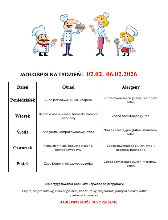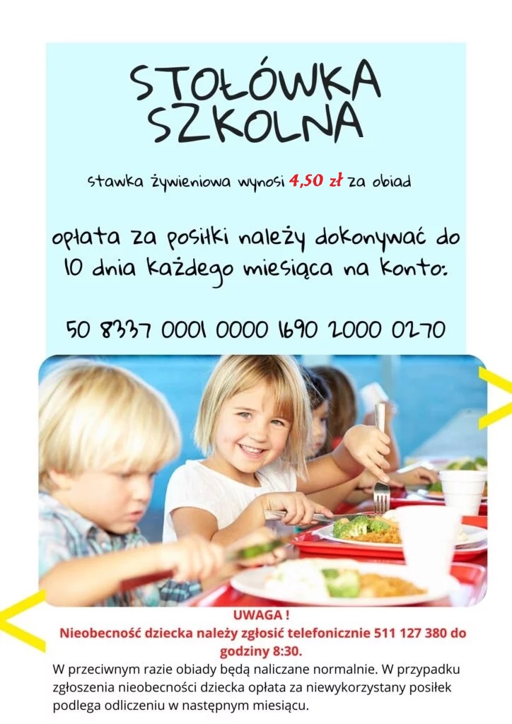 Stawka żywieniowa wynosi 5,00 zł / obiad. Opłatę należy uregulować do 10 dni każdego miesiąca na numer konta: